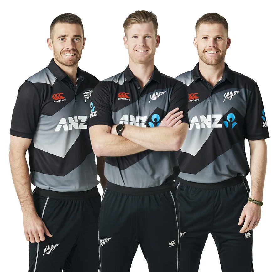 5 out of 5 stars. New Zealand Cricket T-Shirts BodylineTShirts. In limited overs cricket New Zealands ODI and Twenty20 shirts feature the ANZ logo across the centre with the silver fern badge on the left of the shirt Canterbury logo on the right sleeve and the Ford logo on the right.